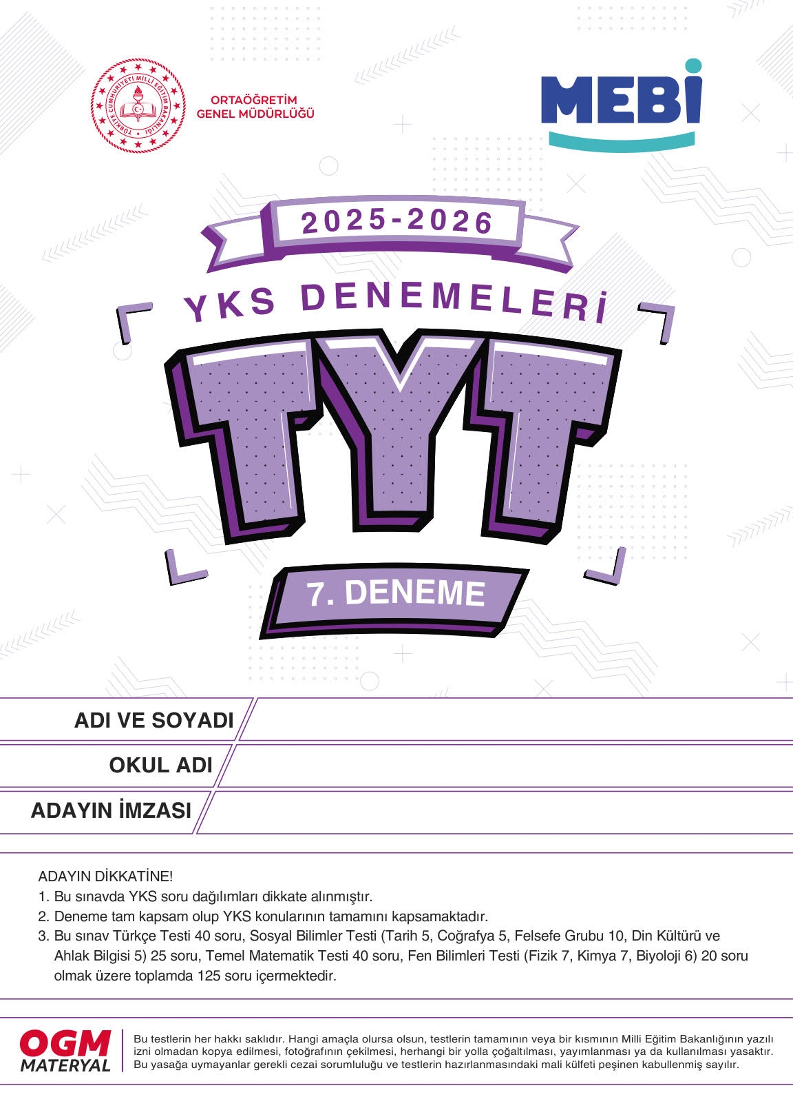 MEBİ YKS Denemeleri TYT 7. Deneme Fotokopinci -